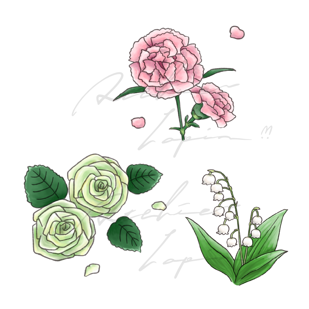(カーネーション、バラ、すずらん)