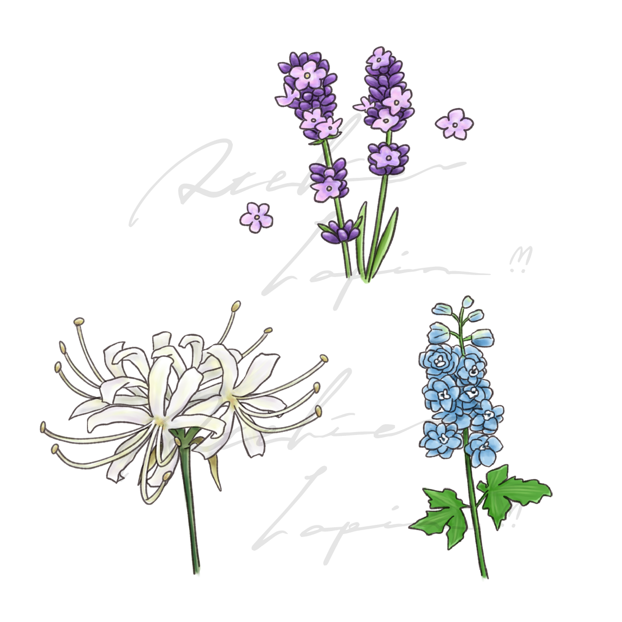 (ラベンダー、リコリス、デルフィニウム)